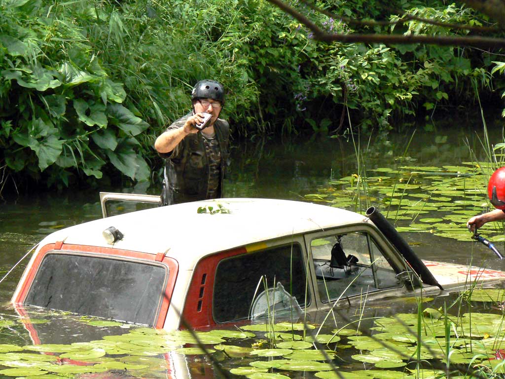 Но вернемся к нашей ситуации. В ходе проведенной разведки вы примерно наметили путь движения. Если фарватер получился достаточно витиеватым, попросите одного из ваших приятелей исполнить роль лоцмана или же, на худой конец, воткните в дно вешки. Очень важен момент выезда! Желательно заранее понять, с чем вы столкнетесь: с пологим песчаным бережком или с отвесно стоящей земляной преградой. Правило одно... Съехать всегда проще, чем выехать, поэтому о том, как выбраться на берег, лучше позаботиться заранее Вроде бы нам ничего не мешает. Ну что, поплыли? Без всякой суеты спускаемся в воду и начинаем движение. Очень важно не гнать перед автомобилем волну, так как она искусственно поднимает уровень воды и тем самым повышается вероятность затопления. Не менее важно двигаться строго по намеченному фарватеру. Старайтесь не буксовать. Обычно дно достаточно рыхлое и шанс на самозакапывание высок. Если все же автомобиль провалился в яму, постарайтесь выбраться задним ходом. Движение в воде не создало проблем? Особое внимание на выезд. Поскольку обычно сразу после брода приходится заезжать в гору, будьте предельно внимательны и помните, что из-за резкого снижения фрикционных свойств колодок тормозов последние некоторое время будут отсутствовать. Не торопитесь, дайте воде слиться из всех ниш и полостей, а затем и попробуйте проехаться на малой скорости, одновременно нажимая на педали газа и тормоза. Нелишним будет вскрыть воздушный фильтр. Если внутри сухо, то можете считать, что ваше первое "плавание" прошло успешно. Да, и не забудьте подключить вентиляторы! Вот, пожалуй, и все рекомендации, которые могут вам пригодиться при преодолении неглубоких бродов. Но поскольку ваш личный джиперский опыт множится, а вместе с ним (я надеюсь) растет и уровень подготовки вашего автомобиля, то, видимо, в следующий раз нам придется поговорить о профессиональной гидроизоляции двигателей и о преодолении тяжелых, а главное, глубоких водных преград.